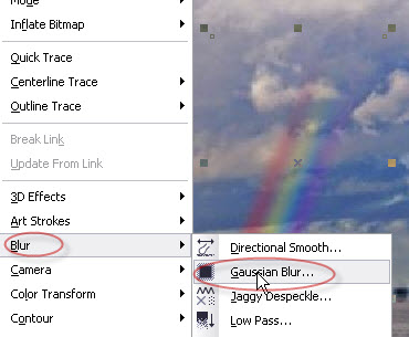 Trus tempatkan posisi diatas object bitmap (misalnya pemandangan) dan beri efek transparant pada object pelangi dengan cara klik object bitmap pelangi pada Toolbox pilih Transparency tool, selanjutnya arahkan mouse pada object dan drag atau geser ke bawah, hasilnya seperti gambar dibawah ini;