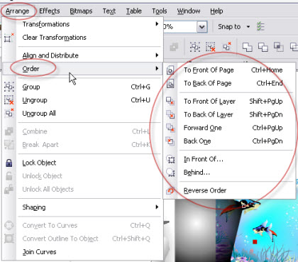 Dan cara untuk mengatur posisi object kita pakai menu Order yang letaknya pada Menu Bar, dan coba sampeyan klik-klik aja nanti sampeyan akan tau sendiri fungsi-fungsi dari menu tersebut dengan syarat ada satu object yang terpilih (terseleksi/aktif)
