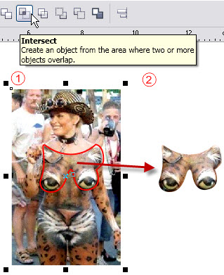 Buat Object bebas dengan Bezier tool yang bertujuan untuk memotong, kemudian select kedua object (gbr.1) dan pada Property Bar klik Intersect, kemudian hasil Intersect coba sampeyan geser kesamping, hasilnya seperti (gbr.2)